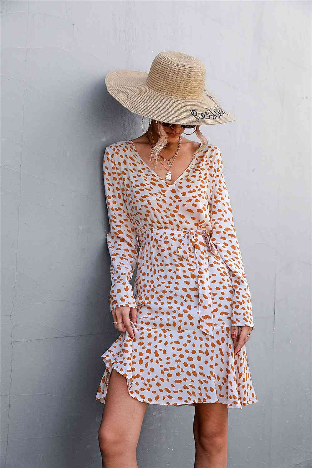 Printed V-Neck Tie Belt Ruffle Hem Mini Dress
